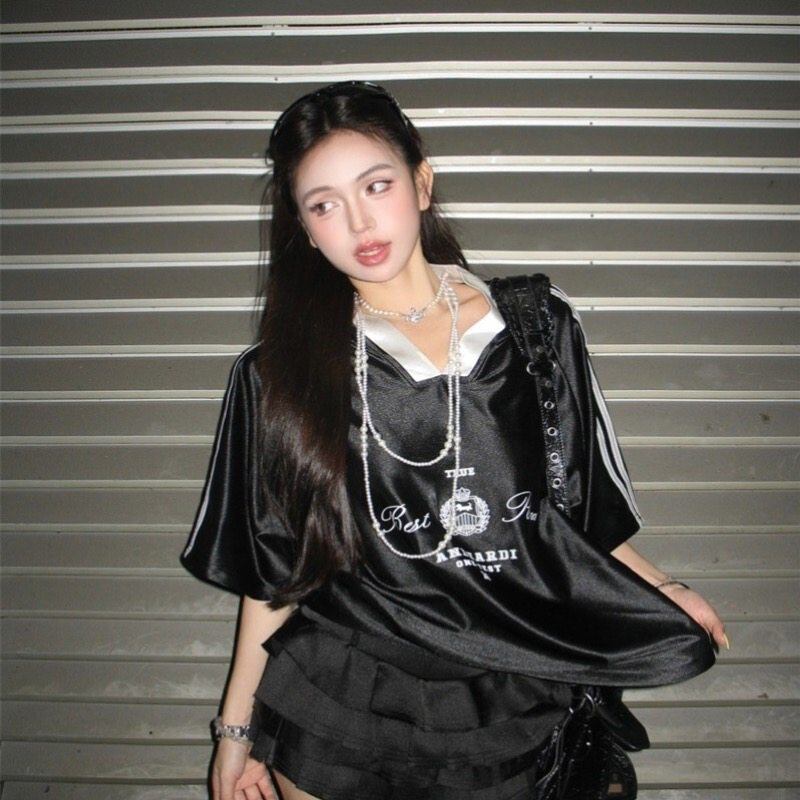 アメリカンカジュアル Vネック サテン風バイカースタイルTシャツ ユニセックス #29